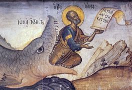 Пророк Иона на спасителния бряг и зад него рибата, която се връща във водата