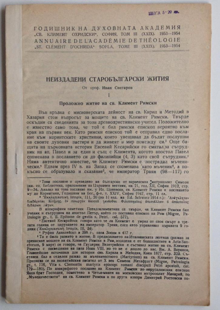 [33]. Снегаров, Ив. Българският първоучител Св. Климент Охридски. – ГСУ, Богословски факултет, 4, 1927.