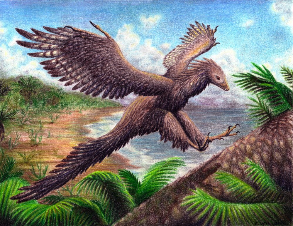 Птеродактилите са полуптици, полурептили (полувлечуги – бел. ред.). Това са гущери, при които силно се развили пръстите на лапите, между тях се опънали ципи, както при прилепите и те полетели над земята. Но, вече следващата им генерация запазила тази дълга опашка като продължение на гръбначния стълб, от двете страни на която израснали красиви пера. Тялото и крилете се покрили с пера, но при раменната част на крилете останали нокти, с които археоптериксите се захващали за клоните.