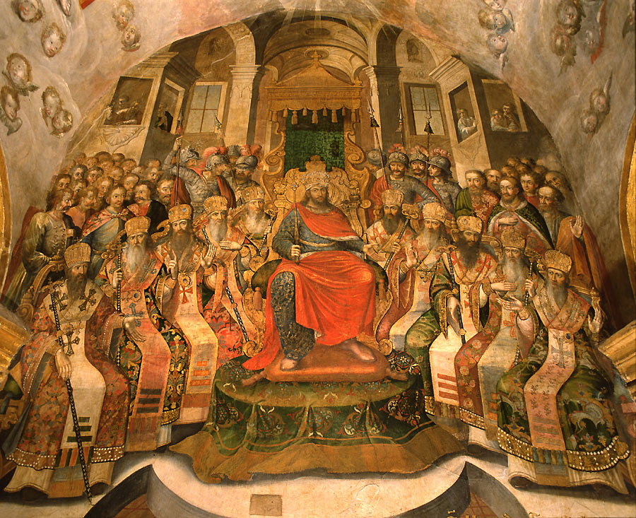 Изображения: авторът Тотю Коев (1928-2006) и част от фреска Първият вселенски събор. Източник Гугъл БГ.