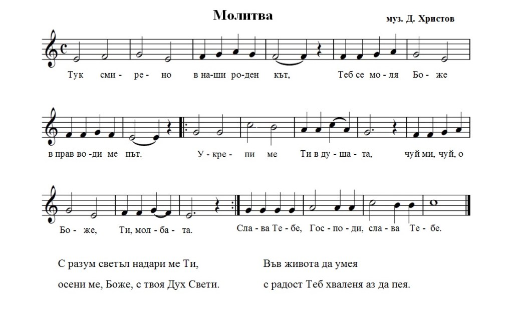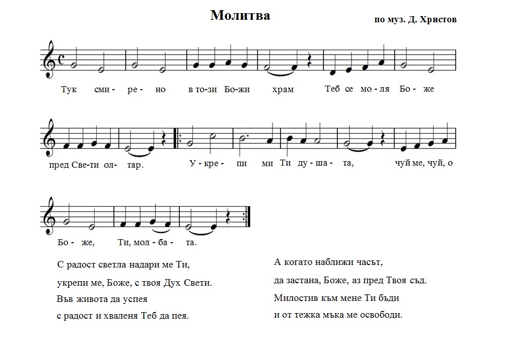 Подходящите за изпълнение песни са много и затова ще бъдат класифицирани тук под общ признак. Една от тях – Молитва – е от Д. Христов, за когото Крачева (2008:135) пише: На практика между светската и църковната музика на Добри Христов няма стилистични различия. Неговата песен вълнува и днес слушателите, дори и чулите я за първи път. По време на Семинара за учители по Религия в Русе, когато тя беше изпълнена с много чувство, точно интониране и прекрасна гласова постановка, трогна всички участници и гости. В музикално и текстово отношение беше променена от оригинала в сборника на Динев, но звучеше по-лесно за масово изпълнение. Тук се сравняват двата нотни варианта на песента: