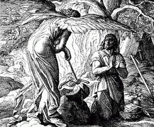 Жертвоприношението на Гедеон пред Ангела /Съд. 6:11- 24/, който му се явил, за да го подкрепи да влезе в сражение срещу моавитците, в момента в който се готви да принесе жертва, като сюжет влиза много късно в християнската иконография. Причината за това е желанието да се предпазят непросветените и неукрепналите във вярата от първите векове на християнството – да не би появата на Ангела при Гедеоновото жертвоприношение да се изтълкува не като проява на милостта на Божията воля, а като култ към Ангелите. Тази ангелолатрия осъжда и св. апостол Павел в Посланието си до Колосяни /Кол. 2-18/, както и Лаодикийския събор през 360 година[31].